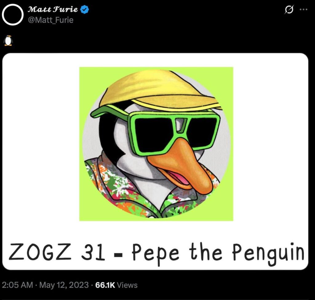 The character appeared in Furie’s Zogz NFT collection and has been acknowledged through multiple tweets from Furie himself. Now arriving on Ethereum, Pepe the Penguin signals a return to the lighthearted, expressive energy that defined early internet culture.